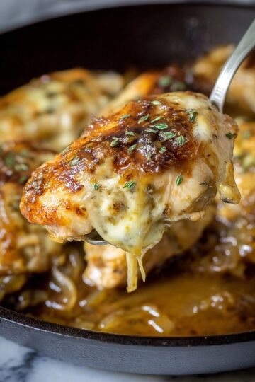 Skillet French Onion Chicken is a savory and comforting dish featuring tender chicken breasts sautéed with caramelized onions and smothered in a rich, flavorful onion gravy topped with melted Swiss and provolone cheese. Perfect for a quick and delicious dinner that combines classic French onion soup flavors with hearty chicken.