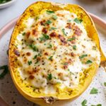 This Skinny Chicken Alfredo Stuffed Spaghetti Squash recipe offers a lighter take on classic creamy Alfredo pasta by using spaghetti squash as a nutritious substitute. It features a savory sauce made with reduced-fat milk, Parmesan cheese, and shredded rotisserie chicken, all baked together with mozzarella cheese for a comforting, low-carb meal.