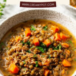 A hearty and flavorful Slow Cooker Lentil and Chicken Soup featuring tender chicken thighs, nutritious lentils, and a blend of spices slow-cooked to perfection for a comforting meal.