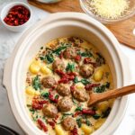 Slow Cooker Tuscan Chicken Meatballs with Gnocchi is a hearty and flavorful one-pot meal featuring tender chicken meatballs simmered in a savory tomato cream sauce with Italian herbs, sundried tomatoes, fresh spinach, and pillowy gnocchi. This comforting Tuscan-inspired dish is easy to prepare and perfect for a family dinner.