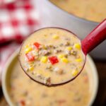A hearty and flavorful cowboy soup featuring ground beef, cheese, potatoes, beans, and a creamy roux base. Loaded with spices and vegetables, this comforting dish is perfect for a filling family meal.