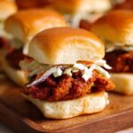 These Nashville Hot Chicken Sliders feature spicy, crispy, juicy fried chicken nestled inside soft slider buns, complemented by tangy coleslaw, sliced pickles, and a flavorful spicy sauce. Perfect for gatherings or a satisfying meal, these sliders bring the iconic Nashville hot chicken experience in a convenient slider form.