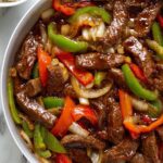 A flavorful and tender Pepper Steak stir fry featuring thinly sliced steak, colorful bell peppers, and a savory sauce thickened with cornstarch. Served over steamed white rice, this recipe offers a balanced and delicious meal perfect for weeknight dinners.