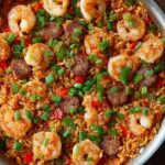 This classic Jambalaya recipe is a flavorful and hearty one-pot meal that combines spicy andouille sausage, tender chicken, succulent shrimp, and a medley of vegetables simmered with aromatic spices and rice for a true taste of Louisiana.