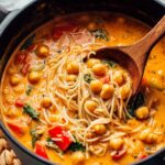 This vibrant Thai Red Curry Soup combines aromatic red curry paste and creamy coconut milk with fresh vegetables and chickpeas, creating a comforting and flavorful dish perfect for a quick and satisfying meal.