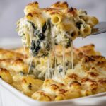 A creamy and comforting Spinach and Artichoke Pasta Bake made with rigatoni, baby spinach, artichoke hearts, cream cheese, pecorino, and mozzarella, baked to golden perfection. This dish combines tender pasta with a cheesy, savory sauce and is perfect for a satisfying family meal.