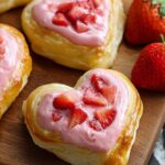 Delight in flaky, buttery strawberry cream cheese breakfast pastries featuring a smooth cream cheese and strawberry jam filling topped with fresh diced strawberries. These charming heart-shaped treats are baked to golden perfection and dusted with powdered sugar, perfect for a special breakfast or brunch.