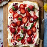 A beautifully fragrant and luscious Strawberry Rose Cake featuring a delicate strawberry rose compote swirled into a tender cake batter, topped with smooth cream cheese buttercream and garnished with fresh strawberries and dried rose petals. Perfect for a snack cake with vibrant floral and fruity notes.