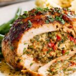 For special dinners, I slice the stuffed chicken on a diagonal, revealing the colorful filling like a little surprise inside—laid atop a bed of sautéed spinach or wild rice it feels elegant and inviting. Adding edible flowers or microgreens can also up the wow factor for guests.
