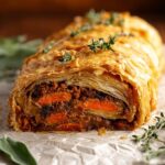 This Mushroom Wellington is a savory, vegetarian dish featuring a rich mushroom and caramelized onion filling layered with sweet potatoes, all encased in flaky puff pastry. Perfect as a hearty main course for special occasions or dinner parties, this recipe combines earthy flavors with a golden, crispy crust.