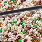 Christmas Crunch is a festive and delicious white chocolate popcorn treat perfect for holiday celebrations. This crunchy snack combines freshly popped popcorn, broken pretzels, colorful red and green M&Ms, all coated in melted vanilla candy melts and topped with Christmas sprinkles for a sweet and salty holiday delight.