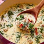 Zuppa Toscana Soup is a hearty Italian-inspired soup featuring savory Italian sausage, tender potatoes, kale, and a creamy broth enriched with butter and heavy cream. This comforting soup is seasoned with mustard powder, dried herbs, and a hint of hot sauce for depth, garnished with Parmesan cheese and crispy bacon for extra flavor. Perfect for a satisfying dinner, it delivers warm, rich flavors and a delightful texture combination.